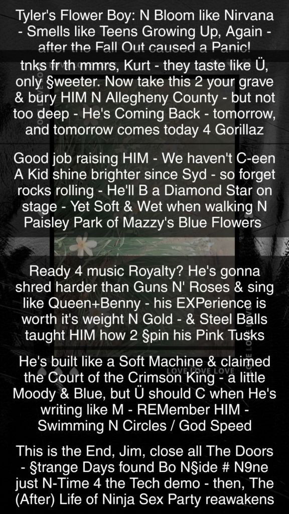 Tyler’s Flower Boy: N Bloom like Nirvana – Smells like Teens Growing Up, Again – after the Fall Out caused Green Panic! all Day like an American Idiot N love with Chemistry.