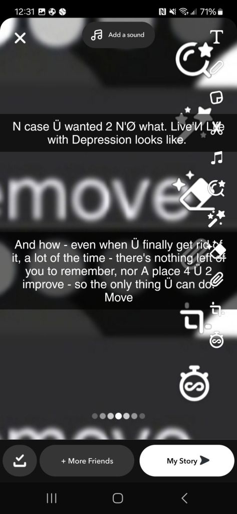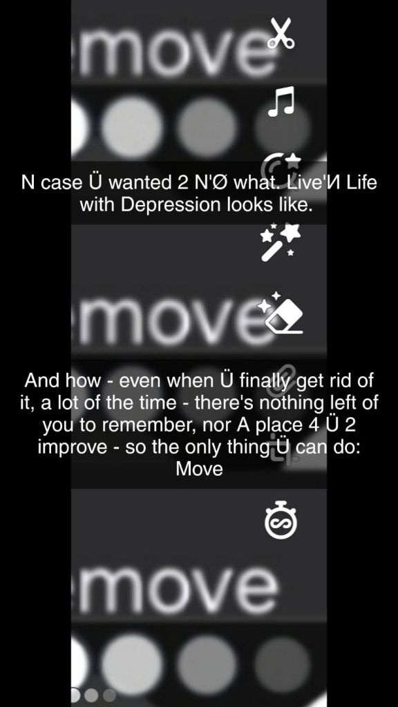 N case Ü wanted 2 N’Ø what. Live’И Life with Depression looks like. And how – even when Ü finally get rid of it, a lot of the time – there’s nothing left of you to remember, nor A place 4 Ü 2 improve – so the only thing Ü can do: Move
