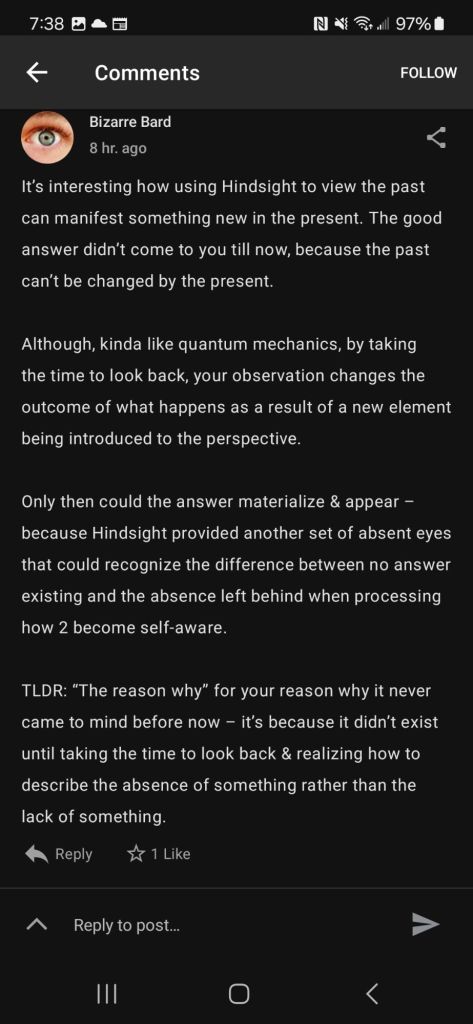 Only then could the answer materialize & appear – because Hindsight provided another set of absent eyes that recognize the difference between no answer existing and the absence left behind by a process yet 2 become self[b]aware.